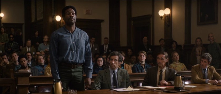 Mark Rylance (William Kunstler) is outstanding as the famous ACLU lawyer. Yahya Abdul-Mateen II (Bobby Seale), the renowned leader of The Black Panther Party, has a handful of scenes but completely takes over the screen in every single scene that he is in. He was actually bound and gagged for days during the trial — insane to realize that this actually did happen in a courtroom of the United States of America. My only issue with this part of the movie is that it doesn’t clarify how long Seale was bound and gagged. I feel like the movie had plenty of opportunities to amplify this fact but ended up minimizing it a bit by not focusing on how long he was restrained.