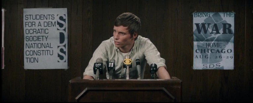 Riveting performances from the entire cast. Sacha Baron Cohen (Abbie Hoffman) is excellent in a captivating performance. Eddie Redmayne (Tom Hayden) adds a unique and believable sensibility to this role. The conflict between Abbie and Tom — and all of their philosophical differences regarding how to move their progressive causes forward is a crucial component of this movie. There is also great chemistry between Jeremy Strong (Jerry Rubin) and Sacha Baron Cohen’s Abbie Hoffman. John Carrol Lynch (David Dellinger) gives a solid performance as the anti-war pacifist leader. Alice kremelberg (Bernardine Dohrn) shows up as a younger version of the future and infamous leader of the Weather Underground organization.