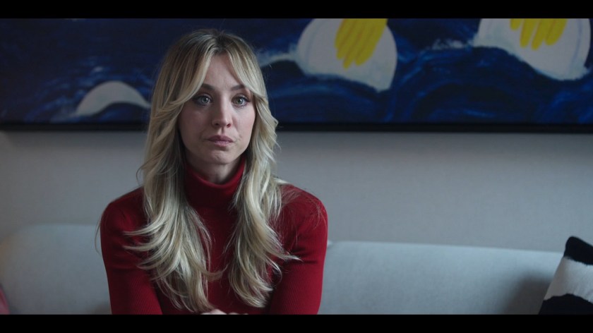 Cassie is this out of control, functioning alcoholic, but in a fun and entertaining way. Kaley Cuoco is excellent here; Her comedic timing is flawless — her body language, facial gestures, and delivery come naturally. No doubt all those years in hit sitcoms like The Big Bang Theory has paid dividends. Her alcoholism and self-destructive behavior are crucial to the plot, and Cuoco rises to the dramatic occasion. In lesser hands, this character would have been annoying and not as likable.