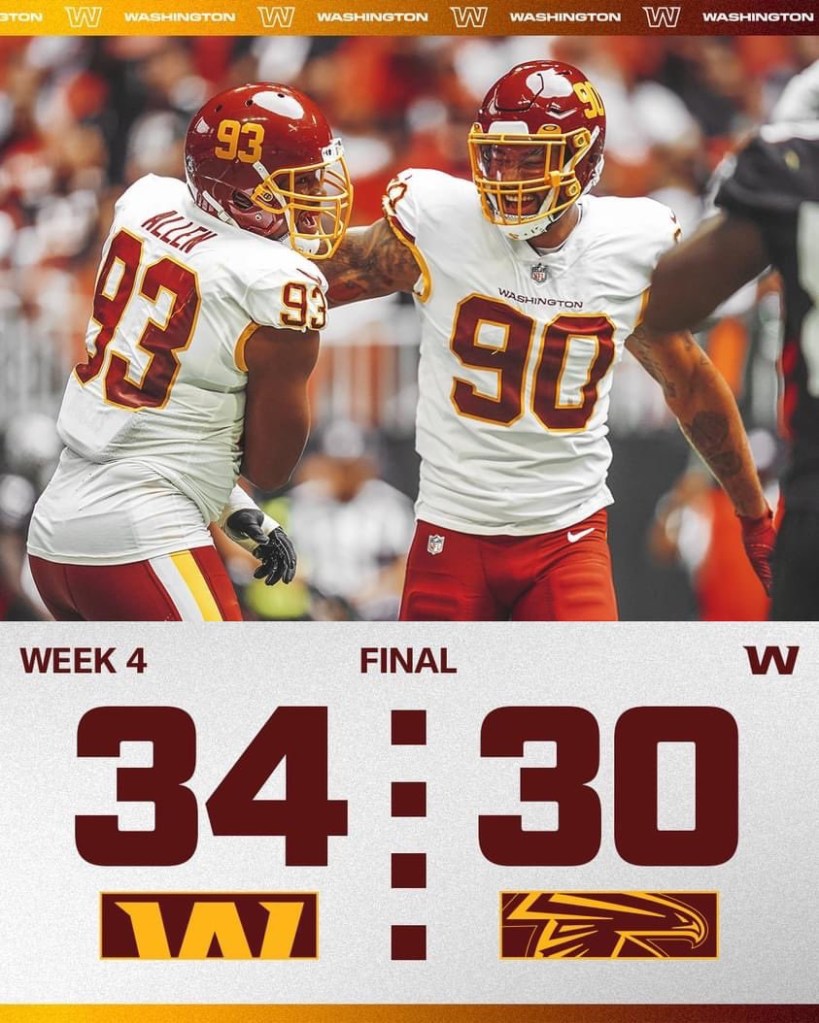 The Washington Football Team wins 34-30. This was a make-or-break game for Washington, a game that could have sent our season spiraling down a black hole of misery. However, Washington found a way to win — it wasn’t a pretty win, but in the NFL, wins are hard-to-come and this was a must-win for us.