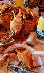 I kept things straight here, ordering a dozen crabs — and as we waited for the crabs to be ready, we ordered some hush puppies and fried oysters as appetizers — and, of course, cold beers. I had a very refreshing Kolsch-style ale from a local brewery called Lost Rhino Brewing Company.