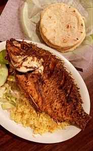 For an entree, I ordered a Mojarra Frita (fried Tilapia, served with yellow rice, salad, and house-made tortillas). This is one excellent dish—a whole Tilapia for $13.00 bucks. If fish is not your thing, they have a tasty Carne Asada dish, also at $13.00.