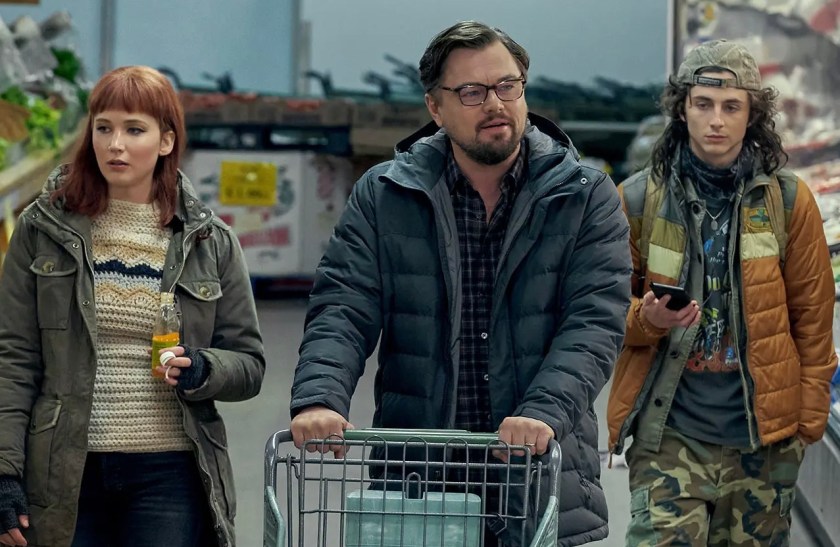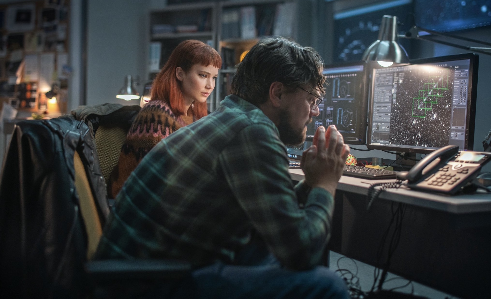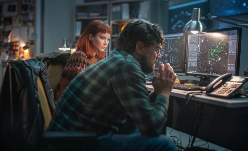 Anyhow, the story centers around the discovery of a comet by a tenure university professor, Dr. Randall Mindy (Leonardo DiCaprio), and a Ph.D. candidate, Kate Dibiasky (Jennifer Lawrence). According to their calculations, this comet’s trajectory is in a direct collision course with Earth. And its impact will potentially be more significant than the comet that wiped out the Dinosaurs. As a result, human life on Earth will probably cease to exist — which means they have to urgently bring this information to the US government and the White House.