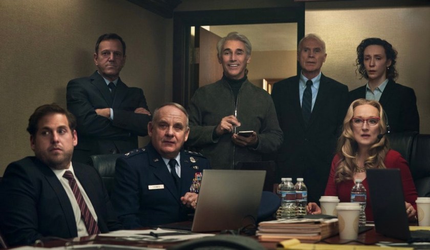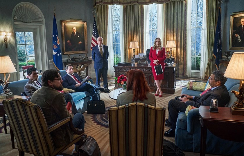 At the White House, the president of the U.S., Jane Orlean (Meryl Streep), doesn’t really take this information seriously and dismisses it as a political distraction from the upcoming elections. It is important to note that Meryl Streep’s POTUS is a right-wing nationalist modeled after Trump. So these two scientists have no choice but to take this information to the media.