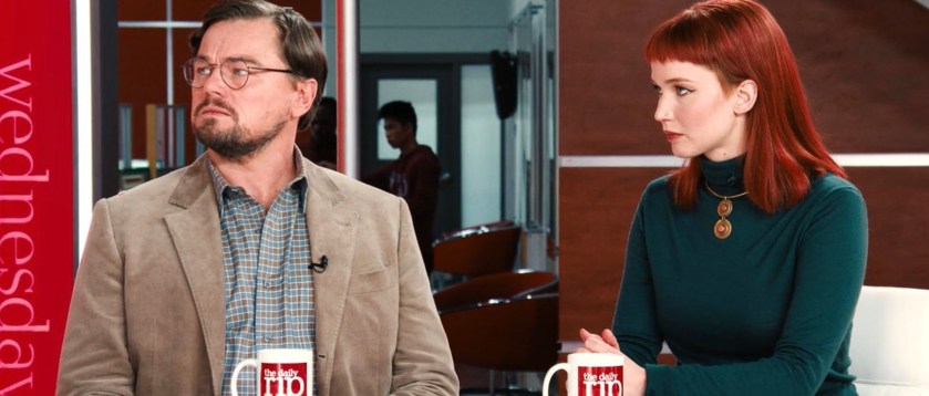 From this point on, it is all-out chaos as our main characters frantically try to convince the world of the severity of this extinction-level event. While the media, the press, and the government don’t seem too concerned about the gravity of the situation. At the same time, most of society seems more interested in the love life of two celebrities. And even Leo’s character falls for celebrity culture and becomes a celebrity scientist, corrupted by fame.