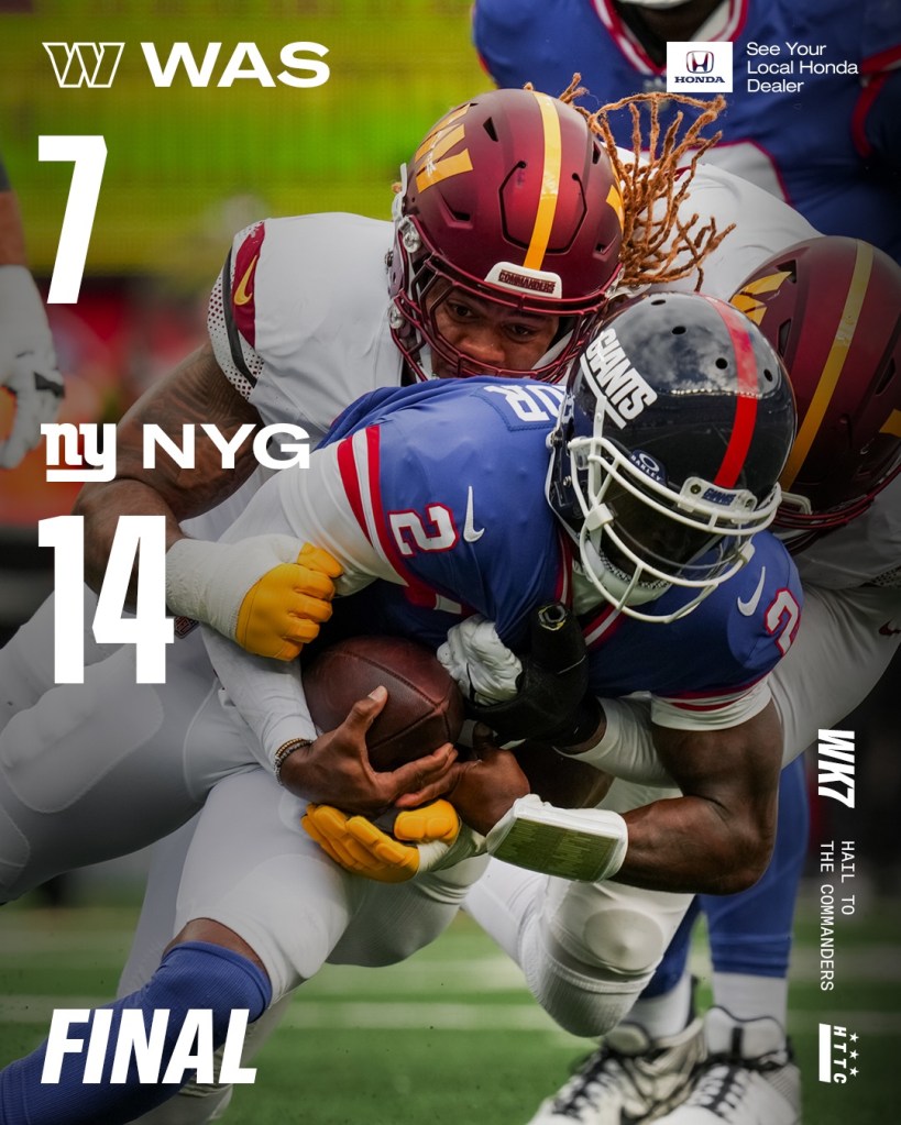 On top of all that, the O-Line’s subpar performance is affecting the effectiveness of the Ground game. Brian Robinson, Chris Rodriguez, and Antonio Gibson combined with 17 carries for 61 pathetic yards. This is another ridiculous statistic.