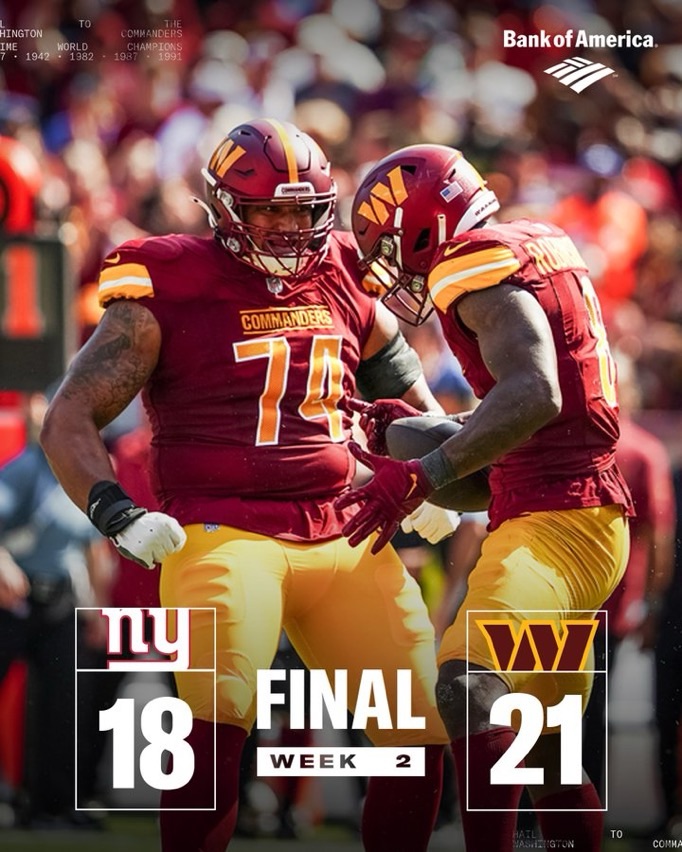 On another note, after missing two crucial kicks in Week 1, Cade York was released, and Austin Seibert was signed—and what a difference it made. Seibert went 7-for-7 on field goals and was the hero of this game. However, the lack of red zone production is worrying. They made four trips to the red zone and failed to score a single touchdown — Terry McLaurin needs to get more targets.
